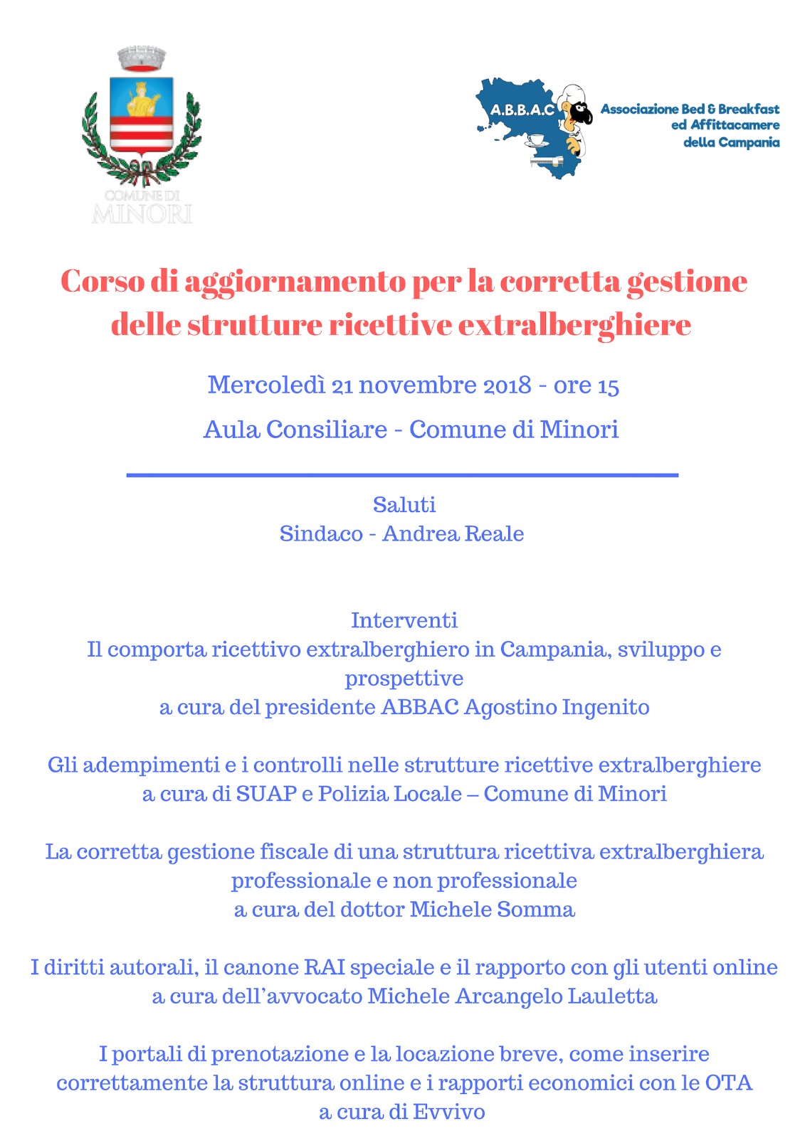 Lo propone L’Abbac, in collaborazione con l’Amministrazione Comunale. L’obiettivo è fornire informazioni sulle novità del settore e con l’aiuto di esperti, conoscere tutte le modalità corrette di gestione fiscale del settore. “Il settore extralberghiero ha un ruolo rilevante nell’economia turistica del territorio- commenta il Sindaco Andrea Reale – Ed occorre accompagnare gli operatori verso una qualificazione che consenta anche di arginare fenomeni di abusivismo e non corretta gestione”.