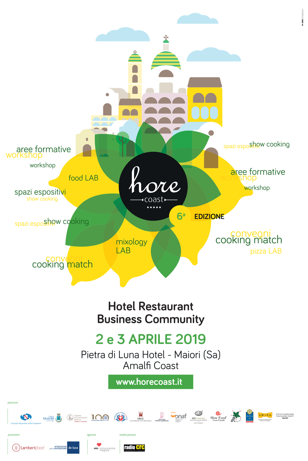 Promosso dalle aziende Lamberti Food e De Luca Attrezzature per la ristorazione, in collaborazione con l’agenzia di comunicazione integrata MTN Company, HoReCoast gode del patrocinio di: Consiglio Regionale della Campania, Città di Maiori, Camera di Commercio di Salerno, Confindustria Salerno, Federazione Italiana Cuochi, Unione Regionale Cuochi della Campania, Associazione Cuochi Salernitani, ONAF (Organizzazione Nazionale Assaggiatori Formaggi), AIS (Associazione Italiana Sommelier), Slow Food Costa d’Amalfi, A.I.B.E.S. (Associazione Italiana Barmen e Sostenitori), A.M.I.R.A. (Associazione Maîtres Italiani Ristoranti ed Alberghi), A.D.A. Campania (Associazione Direttori d’Albergo) e Istituto Statale d’Istruzione Superiore “Pantaleone Comite” di Maiori. Radio CRC radio ufficiale della manifestazione.