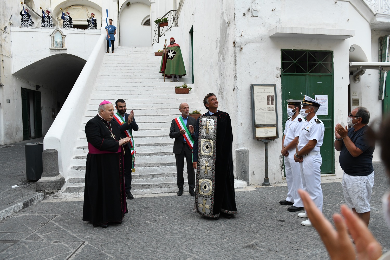 «E’ un’edizione particolare ma nella sfortuna abbiamo un privilegio che è quello di tenere questa investitura nel luogo in cui avveniva l’incoronazione dei duchi – ha detto il sindaco di Amalfi nel suo intervento – E’ accaduto una sola volta, nel 2012, quando reinnestammo il premio del Capodanno Bizantino passando dal duca mastro del diritto al Magister di Civiltà Amalfitana. Proprio quell’anno a causa della pioggia ci riunimmo qui e anche allora fu una cerimonia raccolta e sentita. Proprio come quest’anno. Perché l’orgoglio più grande è rievocare i nostri gloriosi trascorsi di Repubblica Marinara che porta la sua effigie nella bandiera della Marina Militare e Mercantile. Un’insegna che insieme con i vessilli di Genova Pisa e Venezia fa parte di un segmento importante e glorioso della nostra nazione. Abbiamo premiato tanti personaggi importanti dal 2012, ciascuno di essi espressioni di una di quelle eccellenze che abbiamo rievocato e legate al ducato marinaro di Amalfi, ma incredibilmente a questi mancava un uomo di mare. E in questa edizione così particolare, ridimensionata dal momento difficile che stiamo vivendo già da alcuni mesi, ci ha fatto luce una figura che nel mare si è distinta per senso del dovere e che poteva ricongiungere questo pegno con il nostro passato. Ci abbiamo tenuto molto a celebrare questa edizione, la numero venti, che Amalfi e Atrani considerano la manifestazione più importante della loro estate».