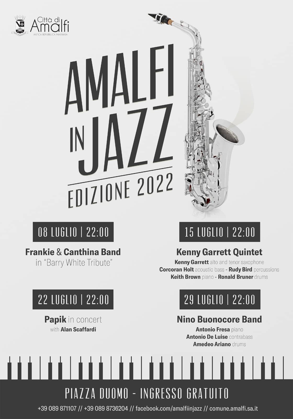 Sarà proprio la rassegna Amalfi in Jazz ad aprire la stagione degli eventi, venerdì 8 Luglio (h. 22 in Piazza Duomo). Protagonista Frankie & Canthina Band in “Barry White Tribute”. Band storica capitanata da Frankie Lo Vecchio, che propone un repertorio internazionale Soul/Funky/Dance/ 70/80, tra ritmi trascinanti e con un’orchestra di 15 elementi, per rendere omaggio al Re della black music.