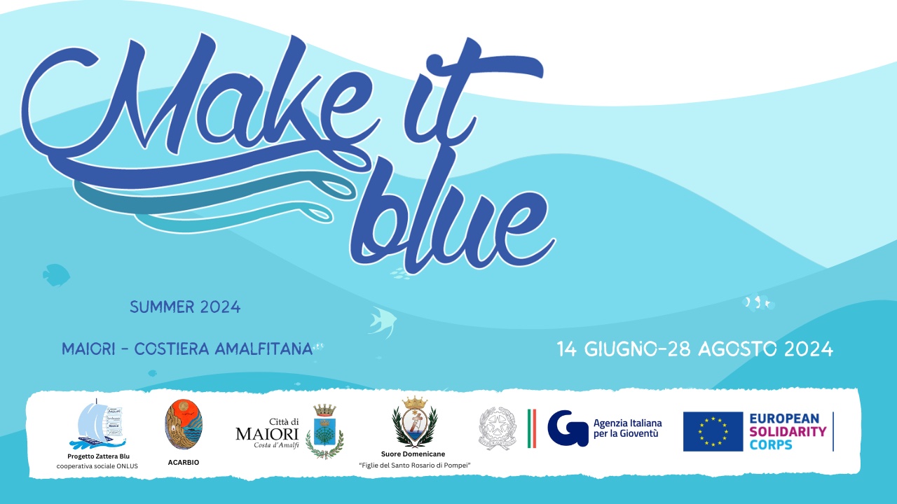 Ritorna in Costiera amalfitana la sesta edizione del progetto Make it Blue. A Maiori l’estate 2024 sarà caratterizzata dalla presenza di un gruppo di volontari, quasi tutti studenti universitari, provenienti dalla Norvegia, Svezia, Germania, Francia, Spagna, Bulgaria, Serbia, Repubblica Ceca, Turchia e Italia, che coordinati dall’associazione Acarbio, in collaborazione con Zattera Blu, con il programma Corpo Europeo di Solidarietà tramite l’Agenzia Italiana per la Gioventù, daranno vita ad una serie di attività.