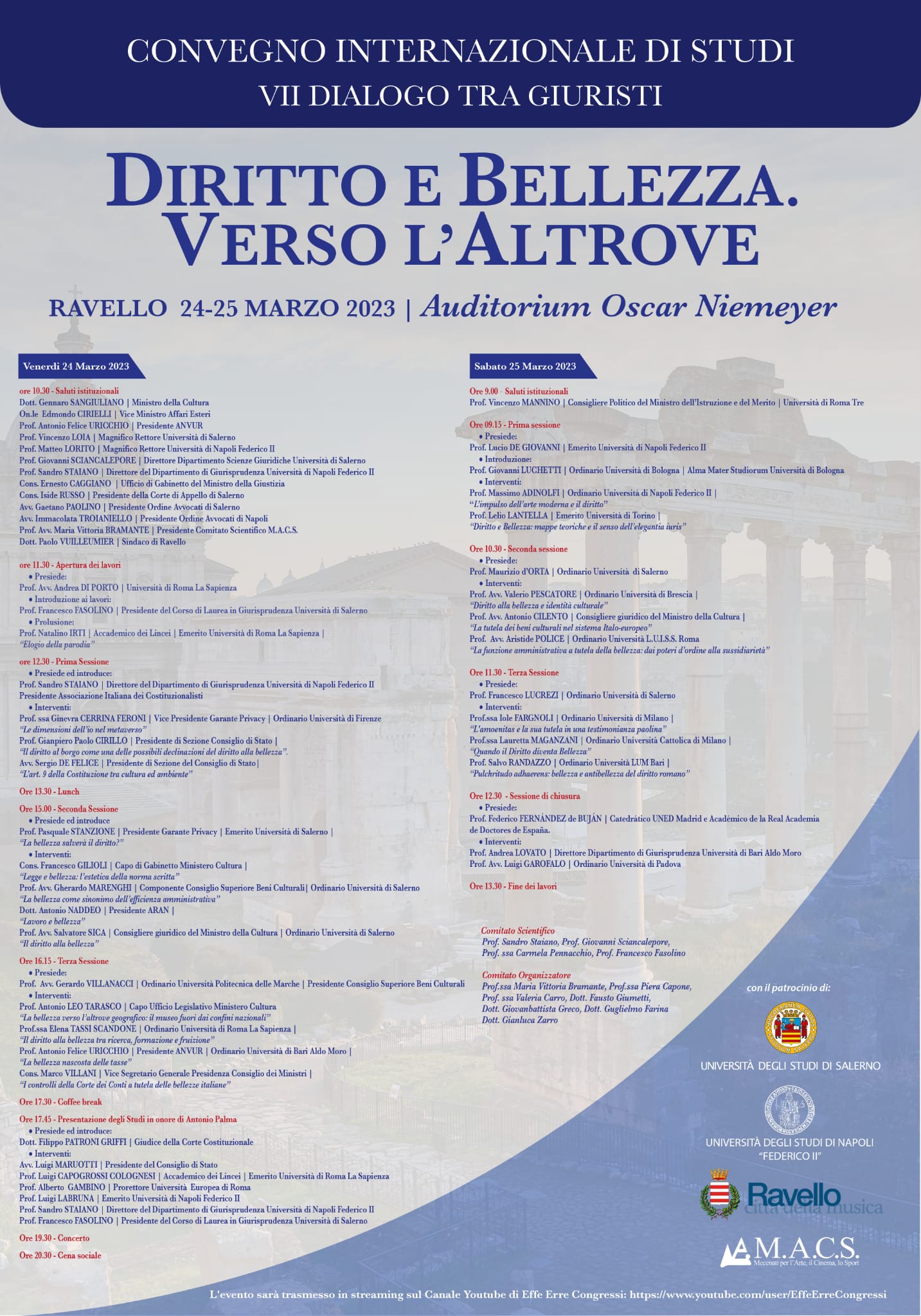 Venerdì 24 e sabato 25 marzo, nell’auditorium Oscar Niemeyer di Ravello si terrà il VII dialogo tra giuristi su “Diritto e Bellezza. Verso l’Altrove”.