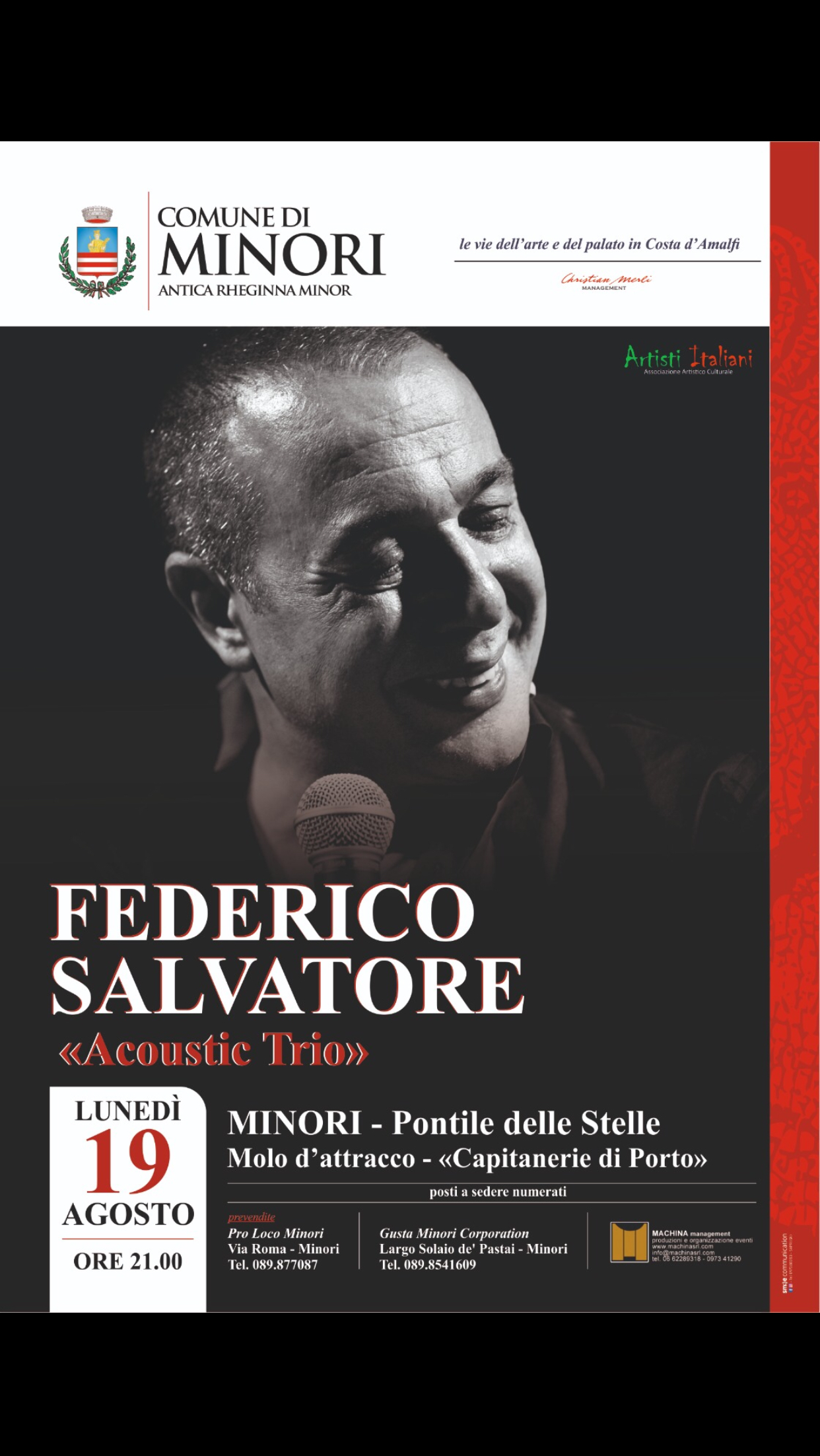 “Ospitare Federico Salvatore a Minori è un grande onore. Un artista che con simpatia e semplicità lancia messaggi, appelli e importanti spunti di riflessione. Completo artisticamente nei sui show è in grado di mettere a confronto se stesso con se stesso, mettendo da parte egoismi e orgogli, spronando inconsciamente il pubblico a fare lo stesso. In un periodo di grande superficialità è doveroso proporre alla comunità esempi positivi che aiutino a riattivare l’individuale capacità d’analisi troppo spesso offuscata da fake news ed informazioni parziali” ha dichiarato Andrea Reale, Sindaco di Minori. “Abbiamo, anche quest’anno, puntato sulla qualità e sull’investimento culturale e continueremo con appuntamenti quotidiani sino a fine stagione. Il 14 settembre chiuderà la rassegna 2019 Neri Marcorè con Le mie canzoni altrui”