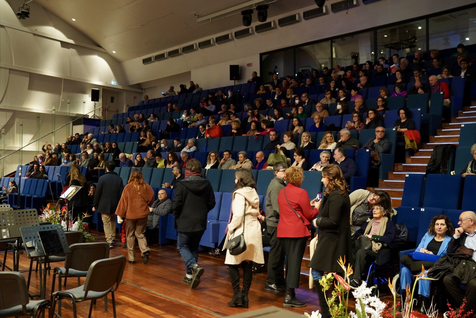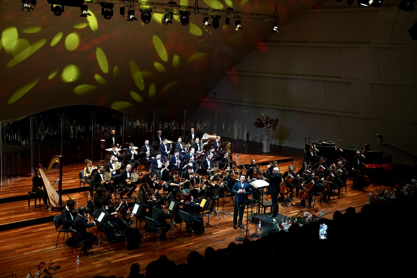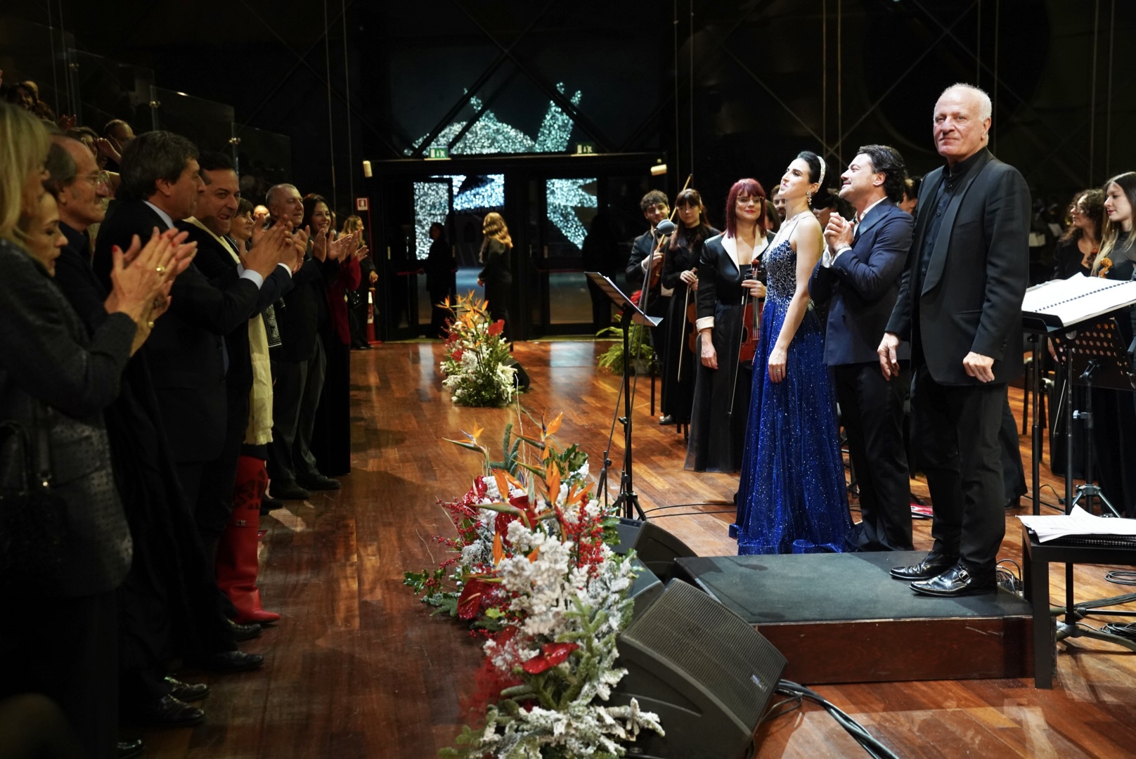 Così White Christmas, Silent Night, Jingle Bells hanno affiancato Adeste fidelis, l’Alleluia da Exultate Jubilate di Mozart, le Ave Maria di Schubert e di Bach/Gounod, Mattinata di Leoncavallo, Non ti scordar di me di De Curtis, Musica proibita di Gastaldon, A vucchella di Tosti intervallate da Christmas Eve Polonaise di Rimsky-Korsakov, da alcuni estratti da Lo Schiaccianoci di Tchaikovsky e da Pizzicato Polka di Strauss. Il medley ha scaldato il cuore del folto pubblico accorso nella Città della Musica che non ha lesinato calorosi applausi all’istrionico tenore aretino e alla bellissima soprano svizzera, elegantissima in abito blu paillettato.