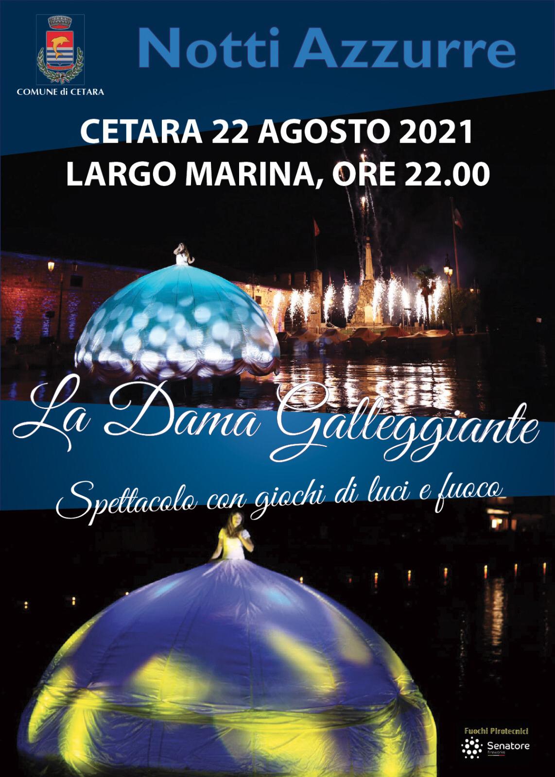 Una serata impreziosita dalla bellezza della cornice naturale della baia di Cetara, il posto ideale per trasmettere le suggestioni e le sensazioni di questo particolare evento, unico nel suo genere. In collaborazione con la Pro Loco Cetara-Costa d’Amalfi, le Notti Azzurre 2021 presentano La Dama Galleggiante: spazio alle emozioni a tutto tondo, domenica 22 agosto, dalle 22, in Largo Marina, dove grandi e piccini saranno spettatori di una straordinaria performance che vedrà protagonista una cantante volteggiare nell’aria, esibendosi in un repertorio di musica italiana e internazionale, con i brani più amati di sempre. A rendere ancora più magica l’atmosfera, abiti sfavillanti e coreografie danzanti nello specchio d’acqua, tra giochi di luce e fuoco, a cura della ditta Senatore. “Un appuntamento imperdibile, per la prima volta in Costiera assisteremo ad un evento scenografico, dal forte impatto visivo, in un borgo incantato che rassomiglia ai racconti delle favole – racconta Angela Speranza, Assessore alla Cultura e al Turismo del Comune di Cetara. Per l’occasione, sarà possibile accedere dalla spiaggia libera e dal Lido Comunale per permettere al pubblico di godersi lo spettacolo dal lungomare.