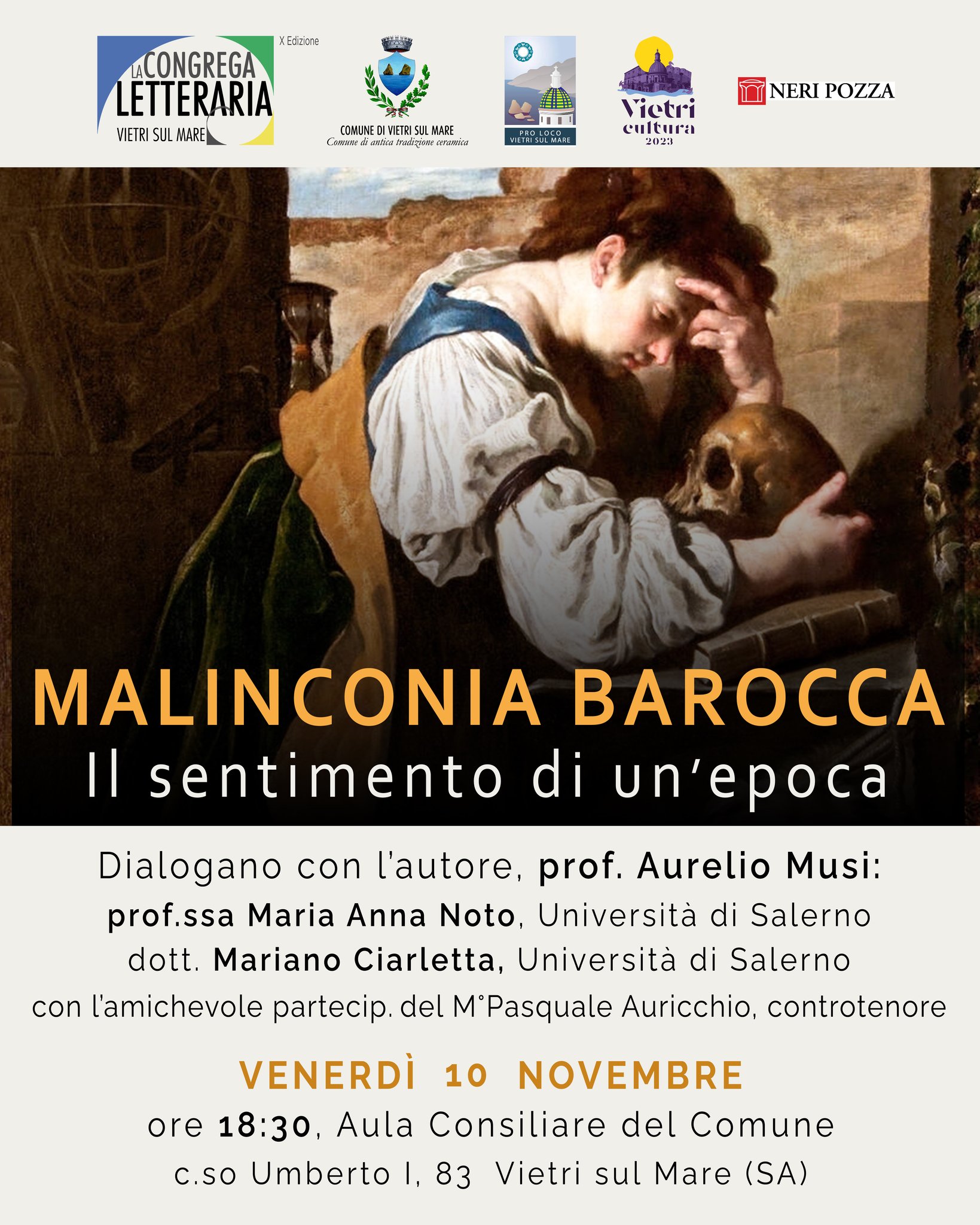 Presentazione del saggio storico “MALINCONIA BAROCCA, Il sentimento di un’epoca”, del prof. Aurelio Musi, storico, giornalista, ufficiale al merito della Repubblica, e già professore all’Università degli Studi di Salerno; volume edito per Neri Pozza.