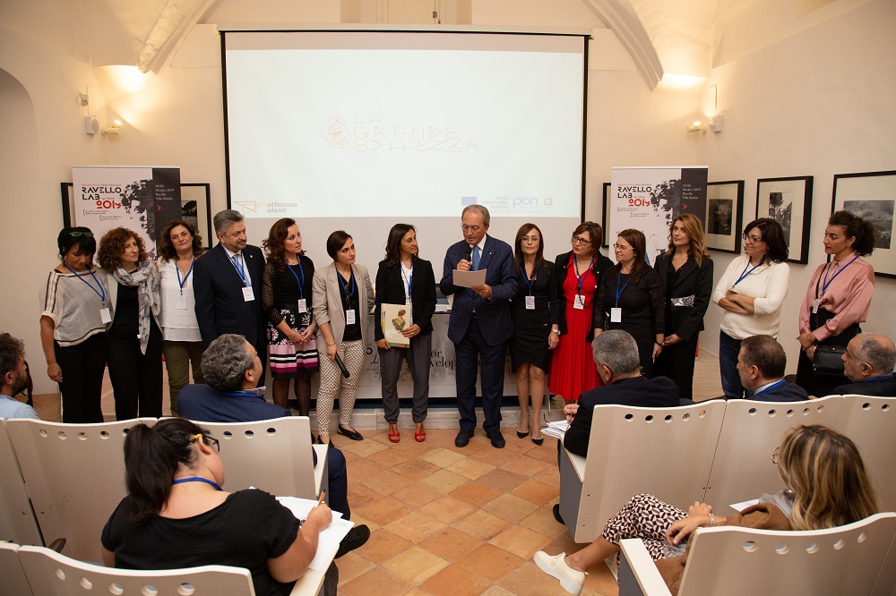 La Commissione, costituita da cinque componenti di cui due stranieri, ha valutato le candidature secondo cinque criteri: impatto territoriale, rispetto dei principi dello sviluppo sostenibile, innovatività dell’intervento, coinvolgimento degli stakeholder e della comunità locale, economicità dell’intervento di valorizzazione. Questa la motivazione: «Il carattere multidisciplinare del progetto ‘La grande bellezza’ impiega gli eventi culturali ed artistici nel vasto contesto territoriale dell’area metropolitana di Napoli – comune di Casalnuovo, di Acerra e di Pozzuoli – come strumenti di costante e continuativo intervento in svariati ambiti dalla formazione al recupero del patrimonio culturale all’inclusione sociale. Un’esperienza innovativa puntata sul valore della comunità della quale esalta ‘la grande bellezza’». Stefania Piccolo e Alessandra Magnacca, rispettivamente Presidente e Direttrice organizzativa dell’associazione, hanno ritirato il premio e omaggiato la commissione di Ravello Lab con il “Piccolo atlante dei volti”, pubblicazione a cura di Salvatore Liberti, esperto coinvolto nel modulo di mapping. Con le organizzatrici, hanno ritirato il premio: Michelangelo Riemma, dirigente scolastico dell’IC Aldo Moro di Casalnuovo; Rita Canosa, dirigente scolastico dell’IC Don Milani Capasso di Acerra; Anna Iossa, dirigente scolastico della Scuola media Caporale di Acerra; Ida Conte, coordinatrice e vicepreside del Liceo Majorana di Pozzuoli; Maria Pia Ardolino, docente dell’IC Don Milani Capasso; Annabella Angrisani, docente della Scuola media Caporale; Rosa Nappi, docente dell’IC Aldo Moro; Luigia Mocerino, docente dell’IC Aldo Moro, e le esperte Raffaella Picascia e Maria Mautone.