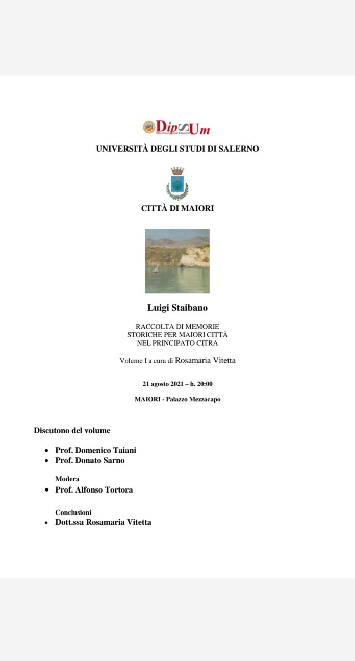 Sabato 21 agosto alle ore 20 a Palazzo Mezzacapo a Maiori verrà presentato il libro di Luigi Staibano “Raccolta di memorie storiche per Maiori Città per il Principato di Citra – Volume I”, a cura di Rosamaria Vitetta.