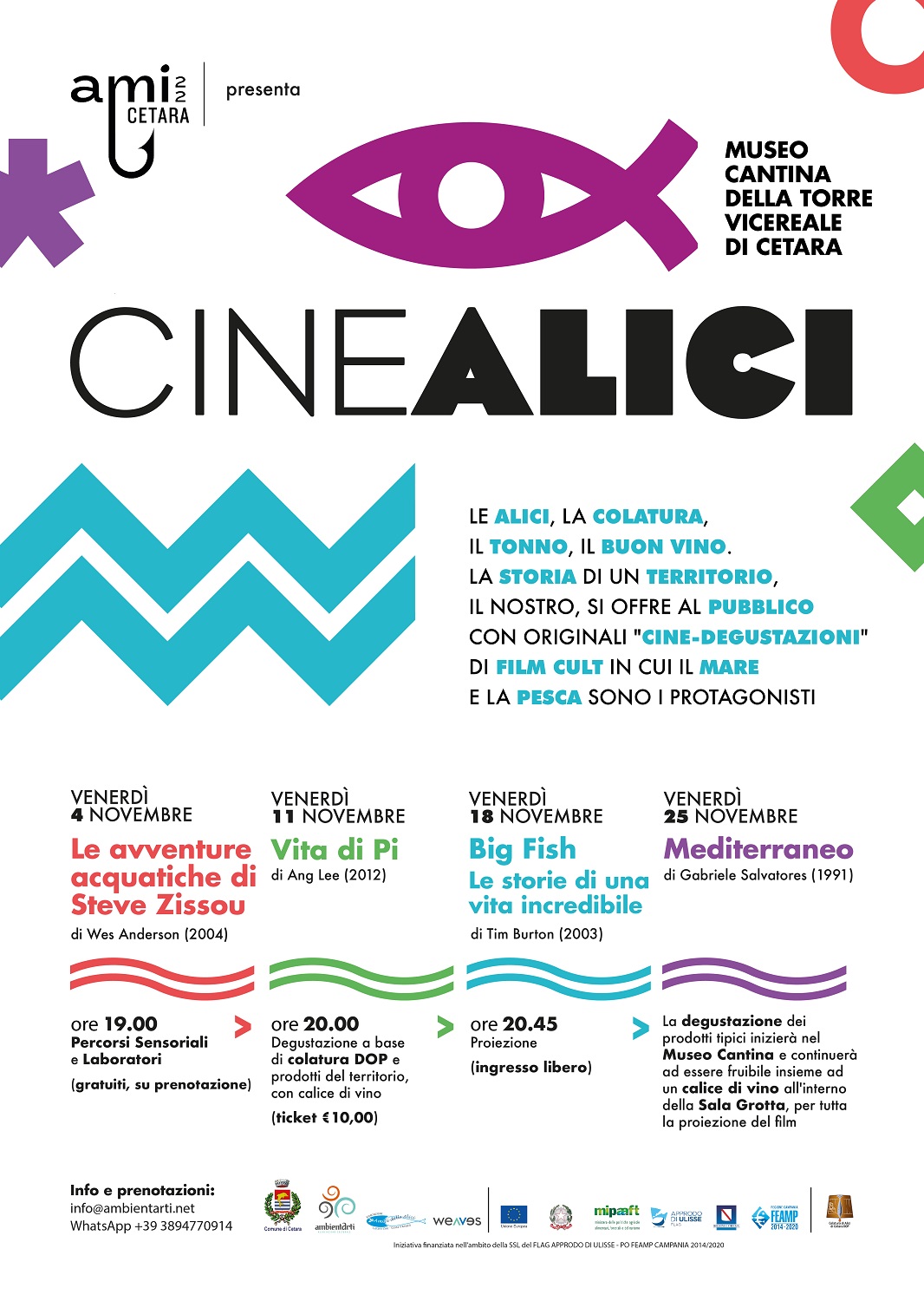 Ritorna, al Museo Cantina della Torre Vicereale di Cetara, la nuova edizione di Cinealici, l’originale rassegna di “cinedegustazioni” organizzata dall’associazione culturale ambientarti come spin off al cartellone di Ami Cetara che, la scorsa estate, ha animato Piazzale Grotta. Per tutto il mese di novembre, saranno 4 appuntamenti, 4 film, 4 percorsi sensoriali, 4 degustazioni “in cui la Colatura di alici DOP, ma anche i prodotti del mare, si sposano agli immaginari cinematografici” – questo il concept ideato da Alessia Benincasa, presidente ambientarti che rinnova la formula, dopo qualche anno di stop forzato. La rassegna, finanziata attraverso l’iniziativa SSL del FLAG Approdo di Ulisse, PO FEAMP CAMPANIA 2014-2020, rientra in un percorso di valorizzazione del pescato, che abbraccia un ampio programma di azioni denominato La magia degli elementi.