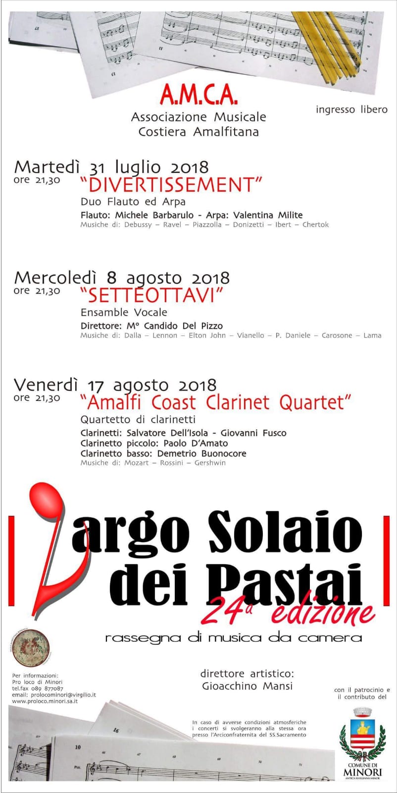 Ritorna la rassegna di musica da camera “Largo solaio dei pastai”. La suggestiva location, incastonata nel centro storico di Minori, ospiterà anche quest’anno una serie di concerti ad ampio respiro che proporranno, come da consuetudine, inedite formazioni che abbracceranno quattro secoli di storia della musica: dal barocco al moderno, dal classico al contemporaneo. Numeroso ormai il pubblico di  appassionati, visto l’alto livello raggiunto dai musicisti  che vede attingere a piene mani dalle migliori espressioni del Conservatorio “Martucci” di Salerno affiancati da solisti di fama internazionale. Il tutto rigorosamente acustico.