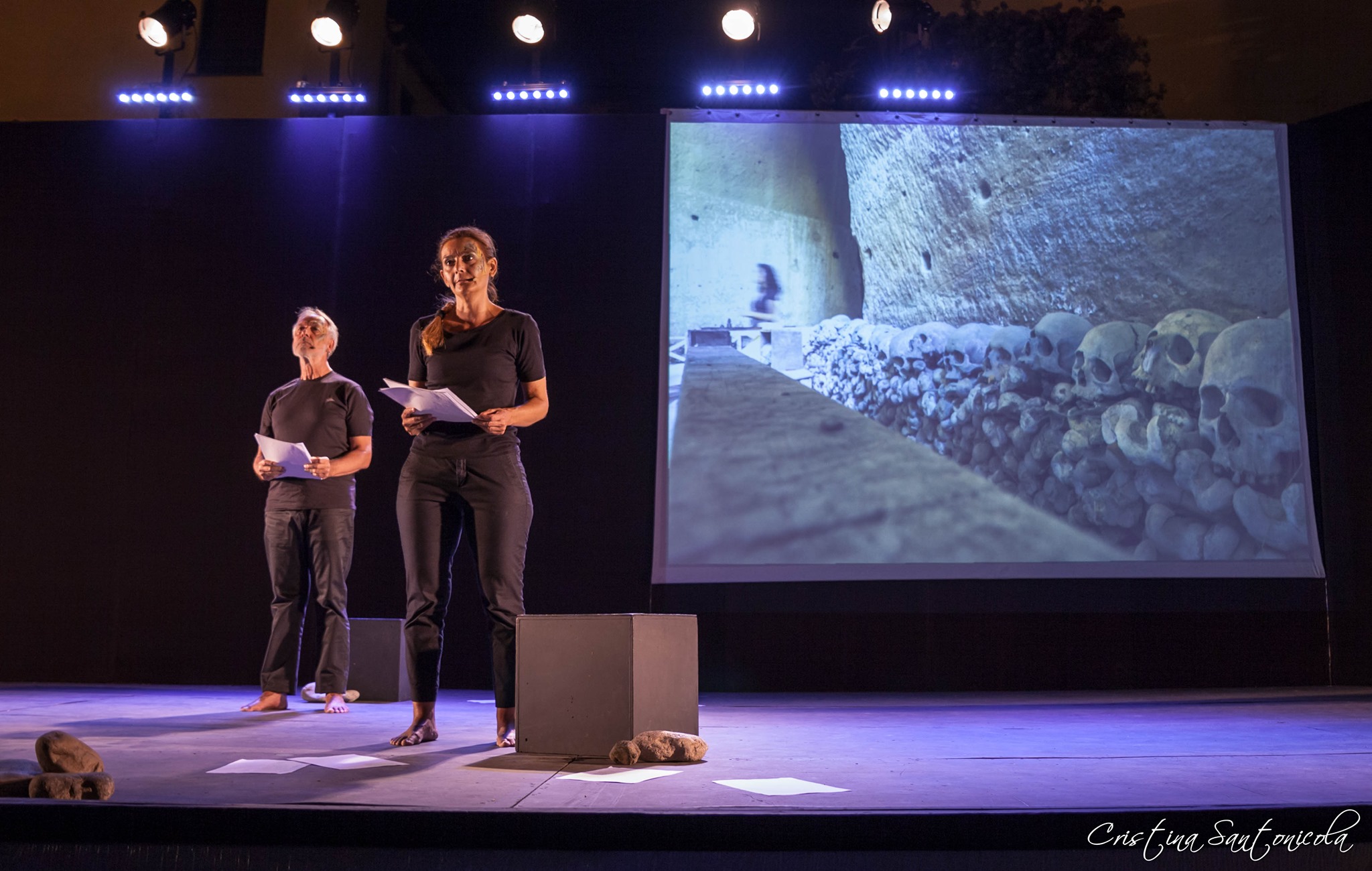 Una strana e insolita traversata del cuore dell’Inferno a cercare per poi salvare “diverse lingue, orribili favelle, parole di dolore, accenti d’ira, voci alte e fioche”. Le due voci narranti diventano, nel corso del cammino, un’unica voce per Dante, Virgilio e i personaggi di volta in volta incontrati. Una voce maschile e una femminile a raccontare – alternandosi e intersecandosi come due rette che nell’infinito spazio infernale si toccano e si lasciano con complicità, con movimenti curati da Virna Prescenzo – della selva oscura, dell’incontro tra Dante e Virgilio, dell’attraversamento della porta della città dolente, del limbo, dell’incontro con Caronte, dell’amore di Paolo e Francesca, della mostruosità di Cerbero, della politica di Farinata Degli Uberti, delle brutte Arpie, del dolce dolore di Pier delle Vigne, del coraggio di Ulisse di oltrepassare “l’oltre”, della disperazione di Ugolino.