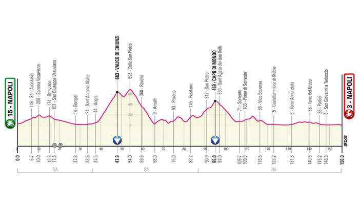 Della tappa non sono state ancora ufficializzate partenza e arrivo ma è possibile una replica di Piazza Plebiscito per il via e Lungomare per il traguardo. Il Giro arriverà a Napoli per la 46/a volta.
