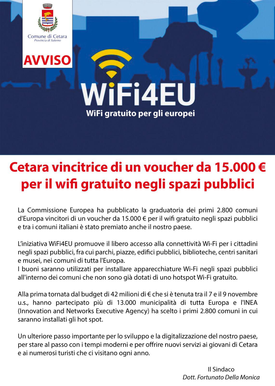 La Commissione Europea ha pubblicato la graduatoria dei primi 2.800comuni d’Europa vincitori di un voucher da 15.000€ per il wi-figratuito negli spazi pubblici e, tra i comuni italiani, è stato premiato anche il nostro paese. L’iniziativa WiFi4EU promuove il libero accesso alla connettività Wi-Fi per i cittadini negli spazi pubblici, fra cui parchi, piazze,edifici pubblici, biblioteche, centri sanitari e musei, nei comuni di tutta l’Europa. I buoni saranno utilizzati per installare apparecchiature Wi-Fi negli spazi pubblici all’interno dei comuni che non sono già dotati di uno hotspot Wi-Fi gratuito. Alla prima tornata dal budget di 42 milioni di euro, che si è tenuta tra il 7 e il 9 novembre u.s., hanno partecipato più di 13.000municipalità di tutta Europa e l’INEA (Innovation and NetworksExecutive Agency) ha scelto i primi 2.800 comuni in cui saranno installati gli hot spot. Un altro passo importante per lo sviluppo e la digitalizzazione del nostro paese, per stare al passo con i tempi moderni e per offrire ulteriori servizi ai giovani di Cetara e ai numerosi turisti che ci visitano ogni anno.