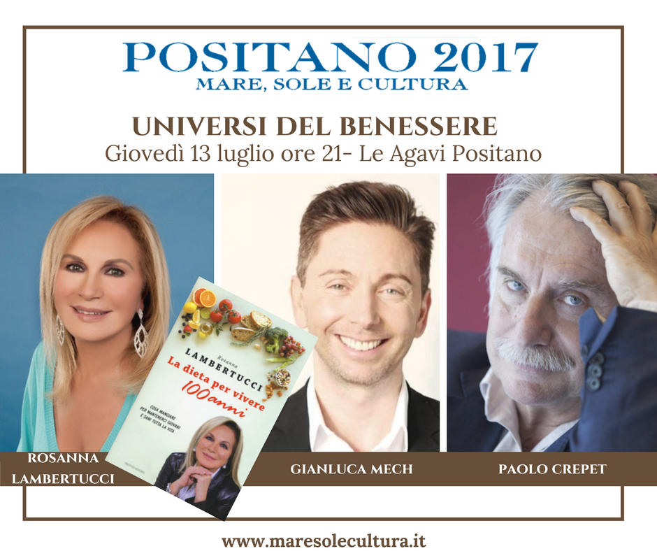 Positano 2017 Mare, Sole e Cultura prosegue giovedì 13 Luglio 2017 (Terrazza Hotel Le Agavi –ore 21,00) con Rosanna Lambertucci, autrice de “La dieta per vivere 100 anni” (Mondadori) che insieme a Paolo Crepet, autore di “Baciami senza rete” (Mondadori) indagherà gli “Universi del benessere”. Vivere a lungo non è sufficiente, ma soprattutto è importante vivere bene e in salute, attivando un circolo virtuoso capace di generare un atteggiamento positivo nei confronti dell’esistenza. Perché anche la salute dell’anima può fare la differenza in un percorso verso l’eterna giovinezza. Con la partecipazione straordinaria di Gianluca Mech.